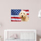 Goldendoodle sits proudly in front of the American flag on Memorial Day.