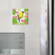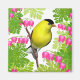 Original fine art design of a male American Goldfinch in Bleeding Heart garden flowers by artist Carolyn McFann printed on a quality magnet for all who love birds.