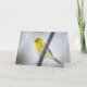 A Christmas card featuring a gorgeous male goldfinch, losing his vibrant yellow color, is perched upon a metal pole on a snowy day. Photo by Karla Chrast
