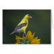 This colourful card features a photograph of a yellow finch perched upon a giant sunflower.