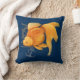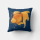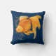 Nautical throw pillow with fantail goldfish, rudder and anchor illustration on navy blue background.