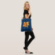 Nautical tote bag with fantail goldfish, rudder and anchor illustration on navy blue background.