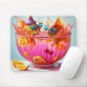 Two splashing goldfish wearing green star sunglasses in a pink punch bowl with orange slices and cherries