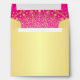 This exotic hot pink and gold envelope has a large central gold scroll circle medallion pattern on the inside with ornate swirled hearts detailing and gold stars and dots that lay over top of a fuchsia pink background with another layer of fine bright lavender purple swirls and scrolls on it that match the Indian inspired wedding and engagement invitations shown below. Customise it with your own return address. If you want to change sizes, please email niteowlstudio@gmail.com to have one made up.
