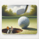 A curious mouse peeks out from a hole in a golf course, staring intently at a golf ball positioned close to the edge of its hole