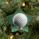 A white golf ball on a white tee in front of a green background on both sides of a ceramic star ornament.