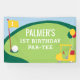 Golf birthday par-tee banner for your party backdrop. Personalise for your golf themed party for any age. This large party decor sign features a golf course, golf cart, red green and yellow balloons.