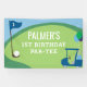 Golf birthday par-tee banner for your party backdrop. Personalise for your golf themed party for any age. This large party decor sign features a golf course, golf cart, green and blue balloons.