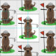 Golf Labrador Retriever - Funny Chocolate Lab playing golf on the golf course, with a golf club in his mouth, a golf ball, and cap. Copyright © Angi Laframboise. Cute sports-related dog breed cartoon gifts for dog lovers and golfers.