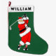 Golf Christmas stocking holiday gift and golf-themed decor for your favourite golfer featuring Santa golfing. To personalise edit text to add golfer's name.