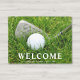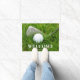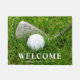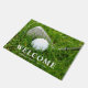 Custom golf themed doormat featuring a golf club and ball on green grass. Use the online template fields to personalise with a your family name.