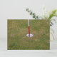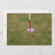 Golf hole on green with red and white flagstick. Photography.