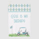 Golf towel, with watercolor graphics of a golf cart and a golf flag, with a blue, white and green argyle pattern, across the top. Golf is my Therapy, in aqua blue text can be personalised to read what you want. Great gift idea for any golfing fan.