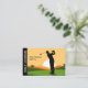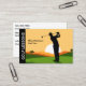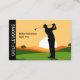 Cool golf lessons business card in a simple yet powerful editable template design you can customise created with a graphic of a golfer swinging a golf club on a golf course.