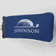 Personalised name in classic font on a navy blue putter club head cover with a unique golf ball and golf club logo graphic design is a great golf gift or keepsake for a golfer, caddy, or golf club membership award.