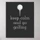 This golf quote poster is for golfers in grey and white with text keep calm and go golfing for wall art decor in home or office.