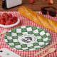 A stylish, round party plate perfect for a golf-themed event at a resort. The plate’s background features a classic green and white argyle pattern, evoking a preppy, golf-inspired look. In the centre of the plate, the resort’s logo is prominently displayed, giving it a professional yet celebratory feel. The logo stands out, surrounded by the clean, crisscrossing lines of the argyle, making it a focal point. The plate’s overall design combines elegance with a playful golf theme, setting the tone for a refined yet fun resort gathering.
