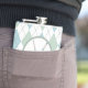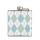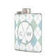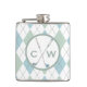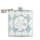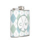 Golf themed drinking flask done in a pale blue, green, and white argyle pattern. A circle, on the front is decorated with two crossed golf clubs. First and second initials in your monogram are ready to personalise.