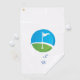 This golf towel is shown in a white colour with a blue and green golf course art graphic print.