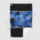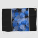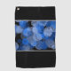 This golf towel is shown in a blue and black multi colour abstract art print with silver accents stripes.