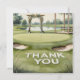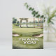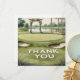 Show your appreciation with this elegant Golf Wedding Thank You Card. Featuring a serene golf course backdrop, the card includes a putting green, sand bunker, and water hazard, with a wooden wedding arbor adorned with beautiful floral arrangements. The words 'Thank You' are delicately crafted in cursive, as if cut from the grass, adding a personal and unique touch. This watercolor-style card captures the beauty and tranquillity of a golf course wedding, perfect for expressing your gratitude to guests.
