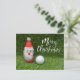 Merry Christmas with snowman and golf ball Card on green grass background