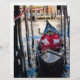 Bella Venezia Italia translates from Italian to English as "beautiful Venice Italy," as this gondola photo elegantly shows. The image features a highly-polished black gondola tied up or moored between posts at a dock on the Grand Canal. The gondola boat itself is varnished to a high gloss black and embellished with gold trim and red velvet cushions to enjoy a romantic cruise past the bridge of sighs with the gondolier singing O Sole Mio!