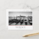 Photo postcard of a row of traditional gondolas in the water with Venice in the background in Italy in black and white with the text 'Venice, Italy' in a white box and with stripes in green, white and red, the colours of the Italian flag.