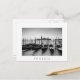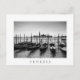 Photo postcard of a row of traditional gondolas in the water with Venice in the background in Italy in black and white with a white border and the text 'Venezia', italian for 'Venice'.