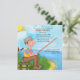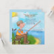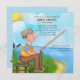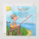 Fun fishing theme Retirement party invitations with blue sky, lake and grass scenery background and man sitting on a log with his fishing rod, tackle box and bait. This unique design is perfect for a man retiring. Name, Date, Location and RSVP Text is ready for you to customise with your information.