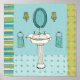 © Lisa Petty / Wild Apple. A charming bathroom painted in blue. The image features a white sink, a blue mirror, blue hand towels, and other accents.