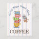 A playful design that starts with a background of soft pink, blue and yellow pastel stripes. The main feature is this colourful stack of coffee cups, the the top one tipping over. The text reads "Good Days Start With COFFEE". On the back of the postcard there is a smaller version of the tipping coffee cup alongside of the return address. Also there are ruled lines on the back for an address. This postcard can be customised.