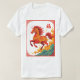 A vivid, celebratory image: a richly ornamented red horse caught mid-stride, muscles and mane rendered as if in motion. The horse’s body is decorated with intricate patterns—swirls, scalloped saddle-like plates, and filigree that give it the look of a festival banner.