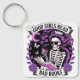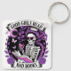 A vibrant, colourful design showcases a female skeleton reading a book while sipping a steamy cocktail. Surrounding her are purple flowers and butterflies, adding to the lively aesthetic. The bold, colourful text reads: "Good girls read bad books." This unique design is available on a wide range of products.