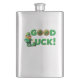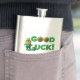 A funny Leprechaun in a green suit with a red beard and a gold coin in his hand wishes you good luck!