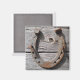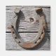 A fridge magnet featuring an old horseshoe with red rust on its surface. The horseshoe hangs on an old fence of aging silver knotted wooden planks.