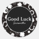 Good luck sticker with black and white lucky pattern design with four leaf clover, shamrock, horseshoe, dice, eight ball. They feature a cute customisable text and image. Perfect for invitations and party bag goodies.