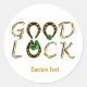 Add Good Luck to a unique and custom design classic round sticker. Black and gold horseshoes and four-leaf clovers wishing Good Luck. Personalise with a name, thank you, message, quote or anything you desire - may be removed. Great multi-purpose craft & party supplies.
