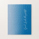 Light to dark blue gradient jigsaw puzzle features "Good Luck, [NAME]" in a white script font near the bottom. Personalise the funny text in the sidebar. Makes a great custom gift for someone who loves a challenge.