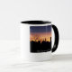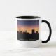 A morning sunrise over the city of Baltimore on a white mug with black trim on the handle and rim.