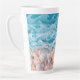 Ocean waves and seashells tall mug. Greet yourself with this "good morning" latte mug and customise with your name. Perfect for sipping coffee or tea while enjoying a beach view, or just gazing out the back door. Use it as a reminder to have a good day at work, but just in case it's needed - envision yourself sitting by the sea and listening to the waves. White script is printed over rolling waves in pretty blue. Colourful seashells make up the bottom border. The design wraps around this tall latte mug leaving a white handle and rim.