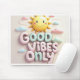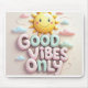 Pastel-coloured bubble letters: GOOD VIBES ONLY. Above the text, a smiling cartoon sun, with sparkles and tiny clouds around. Soft tones on white. A sunshine-packed design to lift the room.