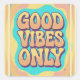 Fun quote text groovy 70s style typography with text good vibes only design.