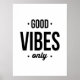 Get this beautiful typography poster featuring Good Vibes Only. Life just is better when you have good vibes. The term good vibes means the vibrations you give out to the world and receive back. Vibrations are all around us.