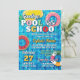 Pool themed back to school party with goodbye pool hello school in a fun typography design against an illustration of a pool with pool floats and inflatables in the form of a sprinkled doughnut, a pineapple, a watermelon, and a classic pool ring.