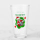 This glass tumbler for beverages has a goofy skeleton wearing a red Santa hat holding red and green ball ornaments up to his eyes inside a dimensional bright red and green splatter shape with a red star on each side of him. Customise your text on the front and back with the templates.