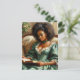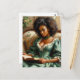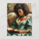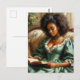 This postcard features a book-lover oil painting of a beautiful black woman wearing an elegant, green 19th-century style dress and holding a book. The melanin-rich beauty has natural hair and is sitting on a couch. She appears to be a wealthy woman of leisure. A soft life, vintage-style academia portrait of a high-society African-American, Afro-Latina, West Indian, Afro-Brit, etc. Great for bibliophiles, bookworms, librarians, and other book nerds!
