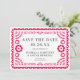 This beautiful papel picado inspired wedding save the date design features a hot pink ornate frame, dark grey text, white background, and modern typography. This elegant yet modern design is a fabulous choice for a Latinx wedding or Mexico destination wedding. On the back is your own "full-bleed" horizontal photo, which can be removed if desired.