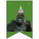 This “Born to Be Wild” party banner features a playful gorilla cutout wearing a birthday hat, bold black text, and cheerful balloon accents. The design includes three green feature flags—one on each end and one in the center—to frame the banner, while the remaining flags stay clean and bright for easy readability.