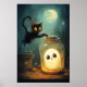 Halloween scene with ghost and black cat.